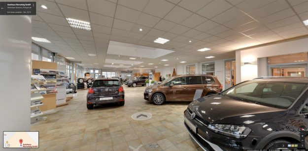Virtuelle 360° Panorama Tour durch ein VW Autohaus und die angeschlossene Lackierwerkstatt. Sichtbar in der Google Suche und in Google Maps.